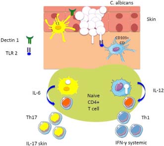 Figure 2 Immune response against Candida. When C. albicans enters the body, it is recognized by innate cells (phagocytes and dendritic cells) through Dectin-1 receptor and Toll-like receptor 2 (TLR2). Upon recognition, these cells produce signals promoting pre-immune CD4+ T lymphocyte (naive) polarization to effector subgroups: Th17 (mainly, IL-17 and IL-22 production) and Th1 (IFN-γ production). The latter, in turn, retro-activate cells for innate immunity. LC: Langerhans cell; DC: dendritic cell.