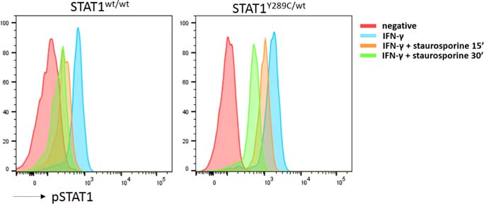 Figure 3 Example of STAT1 phosphorylation and dephosphorylation in a healthy control and a STAT1-GOF patient. STAT1 phosphorylation after IFN-γ stimulation in the presence or absence of staurosporine, a kinase inhibitor, in circulating monocytes is increased in STAT1-GOF patients in comparison with healthy controls, and dephosphorylation is also affected.