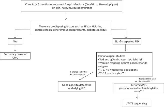 Figure 4 CMC diagnostic evaluation. Secondary causes such as HIV, antibiotics, corticosteroids or other immunosuppressive drugs, and diabetes mellitus should be ruled out in patients with chronic or recurrent infections with Candida or dermatophytes. In the absence of these causes, immunological studies and subsequent genetic studies in the search for primary causes of CMC (PID) are indicated. *PID warning signs: Table 1.33 **Th17 lymphocyte studies are usually only performed in reference centers and should be correlated to age-matched reference values.34 ***If STAT1 phosphorylation/dephosphorylation assay is not available (only in reference centers), may proceed to STAT1 sequencing.
