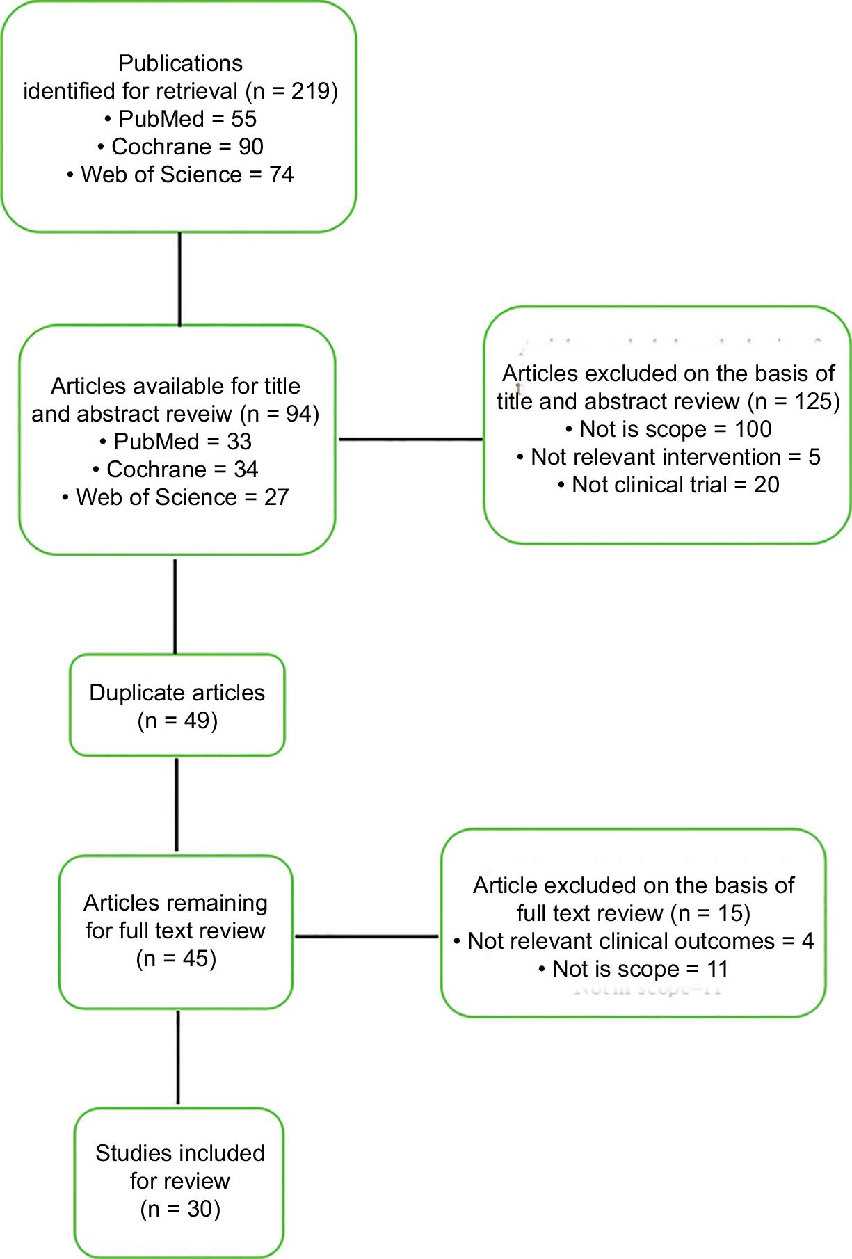 A total of 219 articles were preliminarily retrieval recorded 219 articles, and 45 were obtained through software deduplication, reading papers, and abstracts. Then, the uncertain literature of the selected articles was downloaded. Further, after reading the complete article text, it was screened according to the inclusion and exclusion criteria. Finally, 30 papers were included with about 2708 patients (the specific screening process is shown in Figure 1).