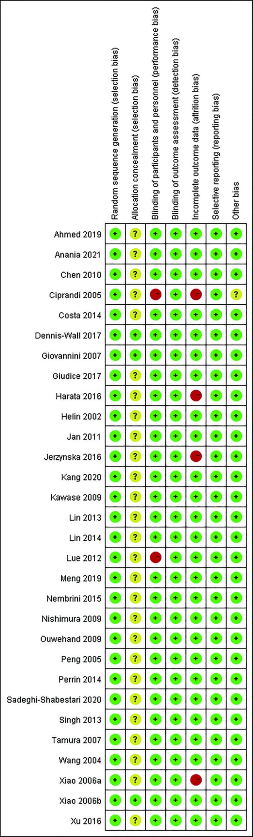 According to the bias risk assessment method recommended by the Cochrane library, 30 of the included studies had random allocation methods; 27 were double-blind; and only three mentioned the allocation concealment. About 20 studies had lost follow-up data, and four were unclear about the reason for the loss to follow-up. None of the studies had selective reporting results; post assessment, one study might have other biases. Figures 2 and 3 indicate the bias risk graph, and a summary of the risk for bias for each study.