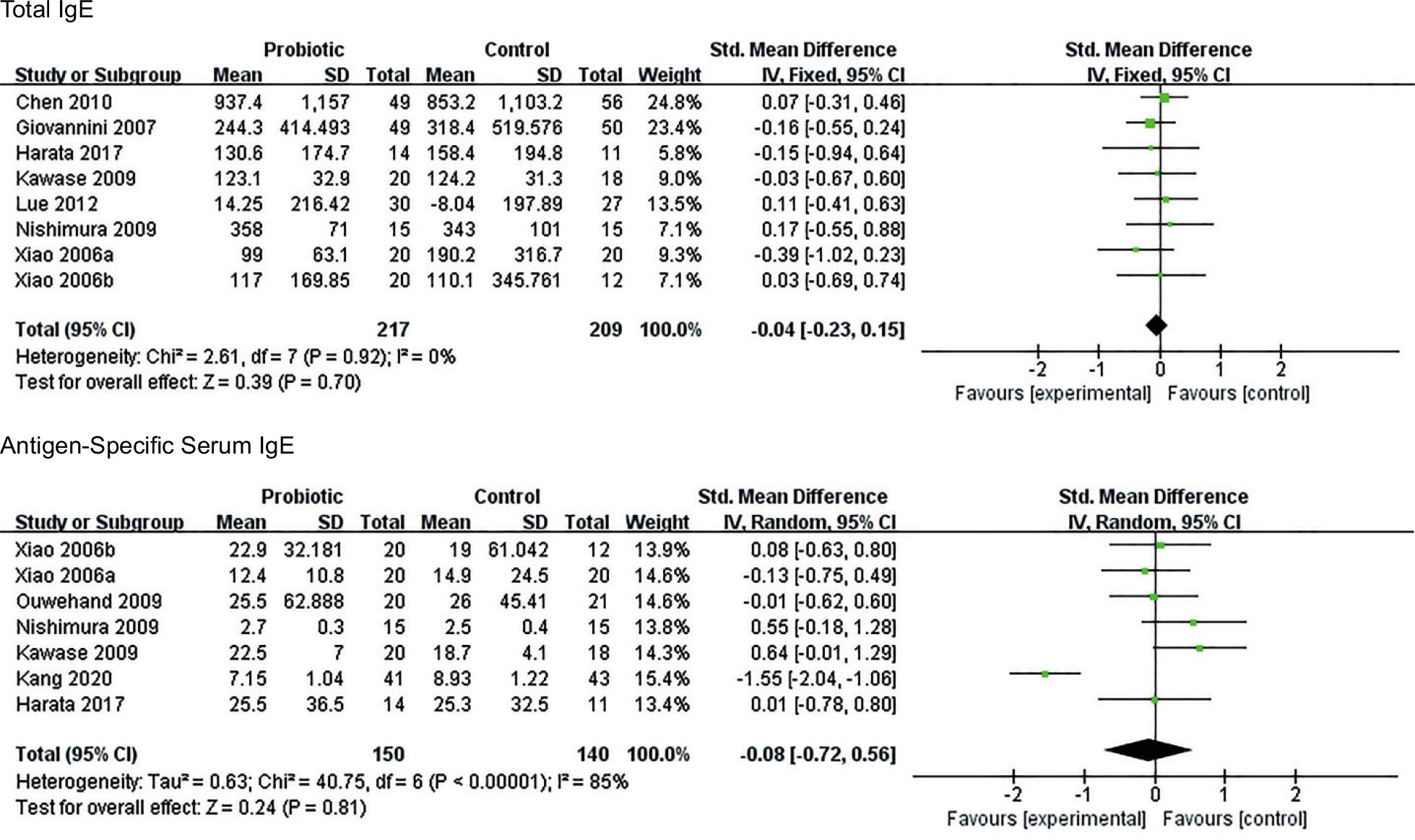 Figure 4 Forest plot showing the comparison of probiotic versus placebo outcomes in the total and antigen-specific immunoglobulin E.