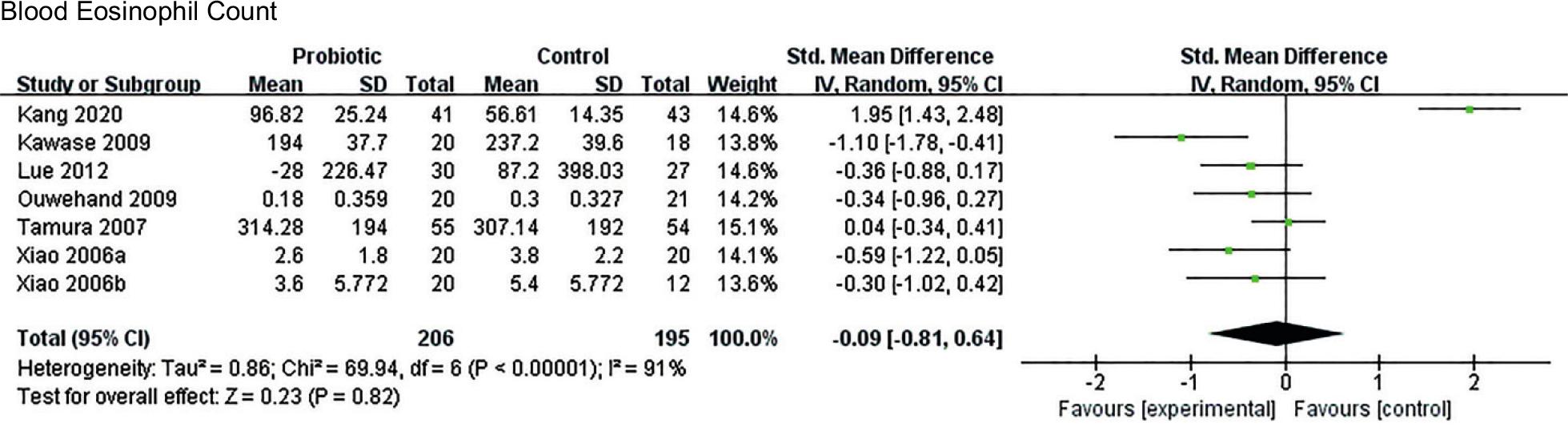 Seven studies evaluated the effect of probiotics on blood eosinophil count (Figure 5). About 206 patients included in these studies received the probiotic treatment, and 195 patients received the placebo treatment. The results of a meta-analysis of blood eosinophil levels showed no statistical difference between the probiotic group and the placebo group (SMD = −0.09; 95% CI, −0.81 to 0.64; P = 0.82). The random-effects model and the weighted combined analysis showed an I2 = 91%, suggesting no heterogeneity between the two groups.