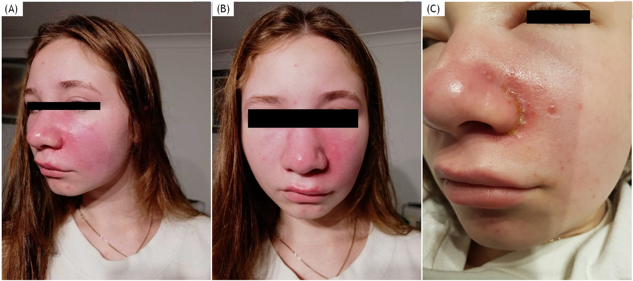 A 15-year-old girl presented to the University Children’s Hospital due to facial swelling of variable intensity that had persisted for several months. Since December 2018, the patient has been under dermatological care due to mild juvenile comedogenic acne treated with standard topical treatment / adapalene. After 2 months, the persistent facial erythema appeared, later accompanied by chronic solid swelling of the left periocular area, nose bridge, left cheek, and upper lip (Figure 1A). Subsequently, the swelling expanded bilaterally, including both eyelids, cheeks, nose, and mouth area, with smoothing of the nasolabial folds (Figure 1B). The lesions were not painful or itchy. The erythema was solid, nonpitting, and nontender. The area’s temperature wasn’t increased in physical examination except for periods of unilateral exacerbation.