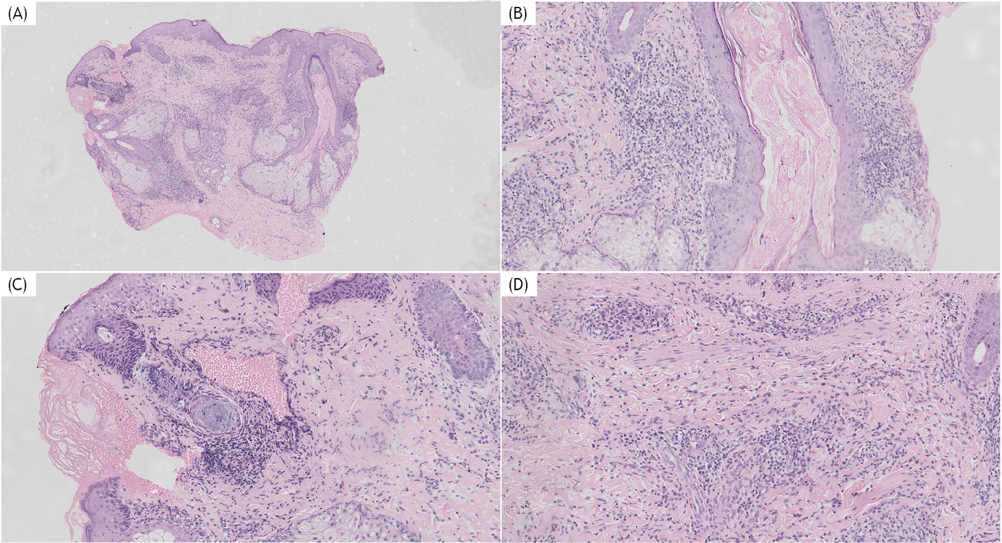 Figure 2 Skin biopsy images (multipanel). (A) Low power magnification (H&E ×10) shows dermatitis and periadnexitis. (B–C) High power (H&E ×40) magnification shows periadnexal lymphoplasmacytic inflammation. (D) (H&E ×40) High power magnification shows perivascular lymphoplasmacytic inflammation