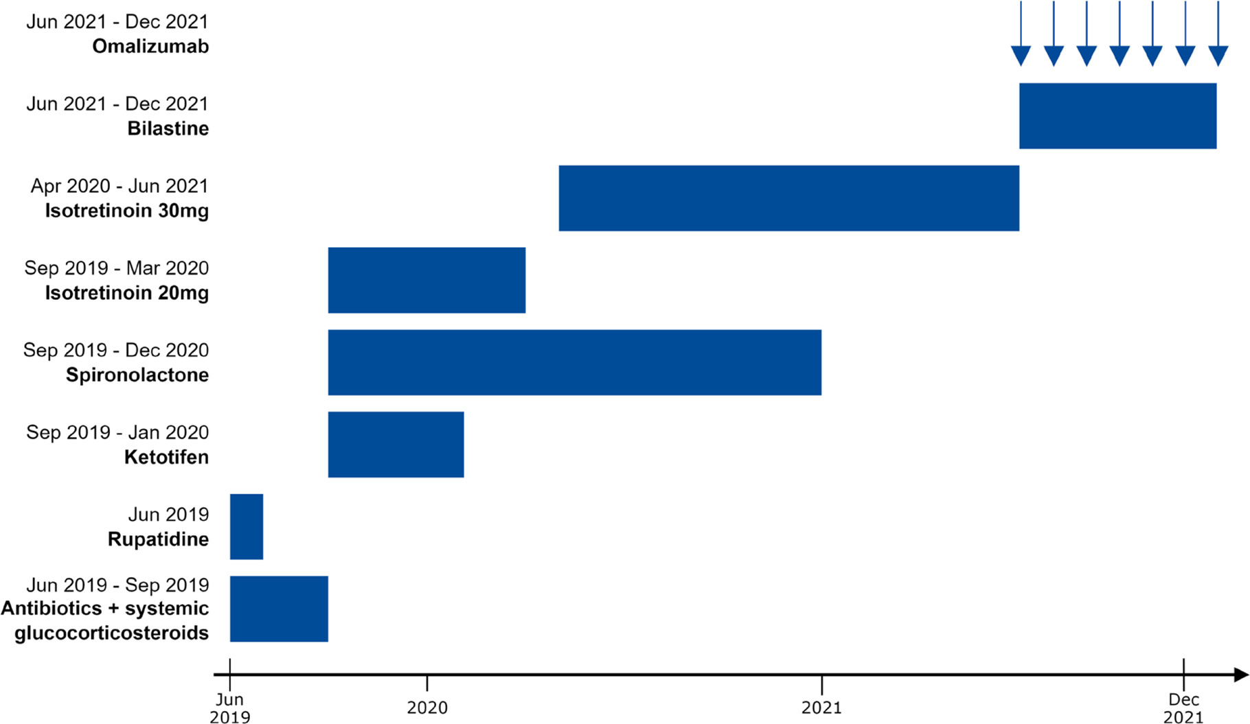 Still, the swelling of the facial skin, including eyelids, nose, mouth, and cheeks, and the deformation of the patient’s face persisted. None of the introduced drugs resulted in complete remission of symptoms, which prompted the search for nonstandard treatment methods. Due to the case report of MS treatment with omalizumab15, the team of specialists decided to administer omalizumab off-label. Biological drugs are given and paid for by public insurance in registered indications as part of the drug treatment programs in Poland. The off-label use of omalizumab was approved by the allergist consultant of the province, the insurance provider (National Health Fund), and the local university Bioethics Committee.