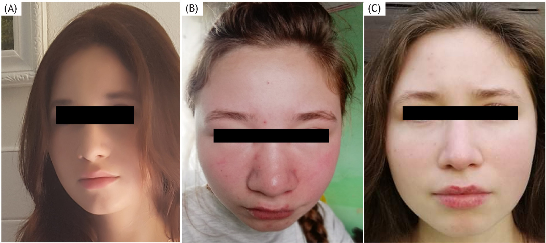 Figure 1 (A–C) Face presentation in the course of disease (multipanel)