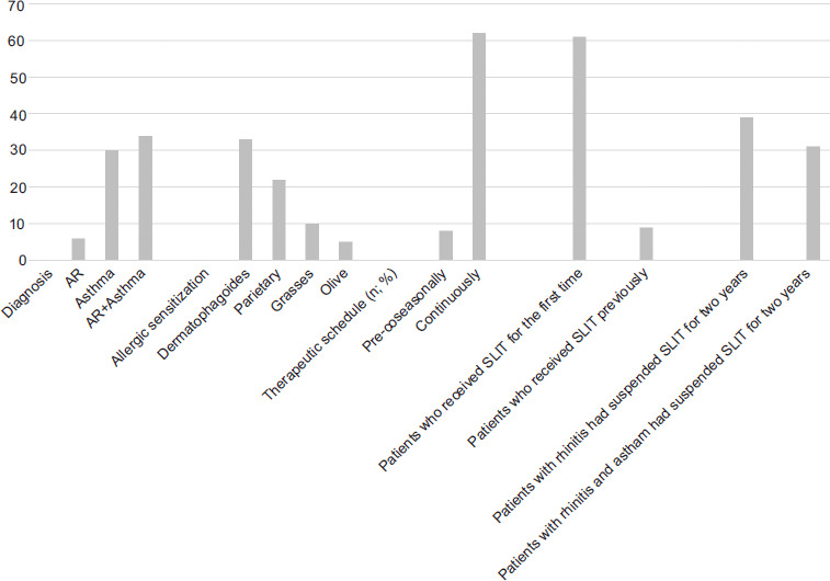 Inclusion criteria were as follows: (i) patients of both sexes; (ii) ages 6-18 years old; (iii) diagnosed with allergic rhinitis, allergic asthma, or both, according to ARIA7 and GINA’s8 criteria, respectively; (iv) mono- or poly-sensitized to ambrosiae, artemisiae, betulaceae, dermatophagoides farinae and pteronyssinus, cat epithelium, grasses, olive and parietaria, as assessed by skin prick test (SPT); (v) treated preseasonally, coseasonally or continuously with grass pollen (ambrosiae, artemisiae, betulaceae, dermatophagoides farinae, and pteronyssinus, cat epithelium, grasses, olive and parietaria) tablets up to 3 years; (vi) stopped SLIT at least 3 years.
