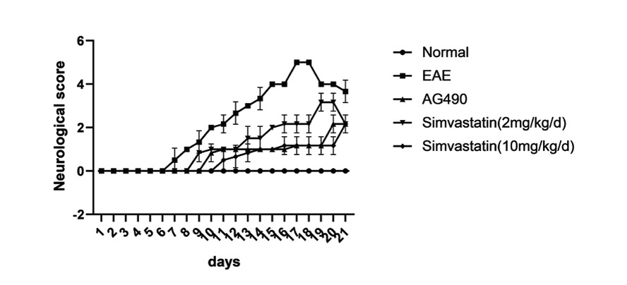 On the 6th day after immunization, EAE mice began to show neurological deficits. The treatment was started on day 1 after immunization. As shown in the figure, symptoms in the EAE, simvastatin (2 mg/kg), AG490, and simvastatin (10 mg/kg) groups peaked on days 17, 19, 20, and 21 (Figure 1).