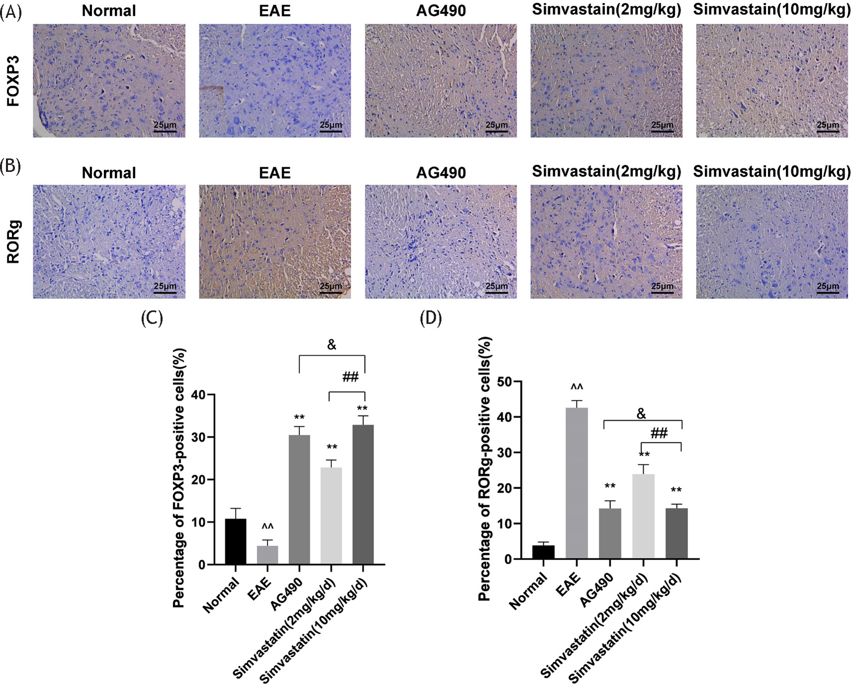 Figure 3 Effects of simvastatin on the numbers of T helper 17 (Th17) and regulatory T (Treg) cells in the spinal cord of EAE mice. The mice spinal cord sections were stained by immunohistochemistry. (A) The number of Treg cells is indicated by forkhead box protein P3 (Foxp3) staining, (B) while the number of Th17 cells is reflected by retinoic acid receptor-related orphan receptor γ (RORγ) staining, (C) Treg cell number, (D) Th17 cell number. All data are expressed as mean ± standard deviation (n=5 in each group). **P<0.01, EAE vs. AG490 or Simvastatin (2 mg/kg) or Simvastatin (10 mg/kg), *P<0.05, EAE vs. AG490 or Simvastatin (2 mg/kg) or Simvastatin(10 mg/kg); ^^P<0.01, EAE vs. normal,^P<0.05, EAE vs. normal. ##P<0.01, Simvastati n(10 mg/kg) vs. Simvastatin (2 mg/kg), #P<0.05, Simvastatin (10 mg/kg) vs. simvastatin (2 mg/kg). & no significant difference, Simvastatin(10 mg/kg) vs. AG490.