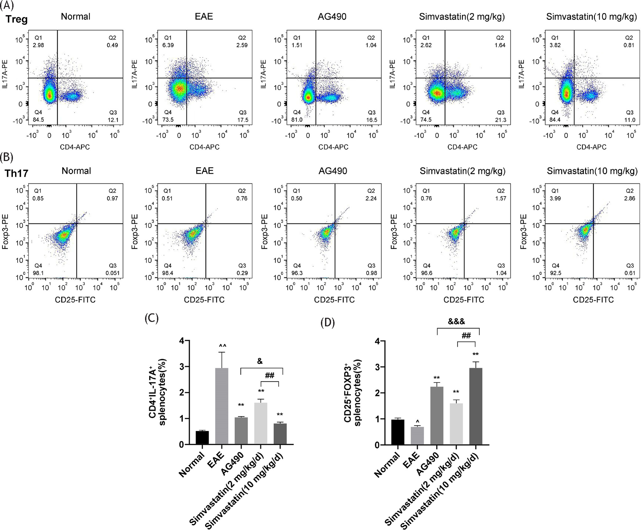 Figure 4 Effects of simvastatin on the numbers of T helper 17 (Th17) and regulatory T (Treg) cells in EAE mice spleen (A,B) The numbers of Th17 cells (CD4+ IL-17A) and Treg cells (CD25+ Foxp3) in mice spleen were determined by flow cytometry. (C,D) Statistical analyses of the numbers of Th17 cells and Treg cells. The data are expressed as mean ± standard deviation (n=4 in each group). **P<0.01, EAE vs. AG490 or Simvastatin (2 mg/kg) or Simvastatin (10 mg/kg), *P<0.05, EAE vs. AG490 or Simvastatin (2 mg/kg) or Simvastatin (10 mg/kg); ^^P<0.01, EAE vs. normal, ^P<0.05, EAE vs. normal. ##P<0.01, Simvastatin (10 mg/kg) vs. Simvastatin (2 mg/kg), #P<0.05, Simvastatin (10 mg/kg) vs. Simvastatin (2 mg/kg). & no significant difference, Simvastatin (10 mg/kg) vs. AG490, &&P<0.05, Simvastatin (10 mg/kg) vs. AG490, &&&P<0.01, Simvastatin (10 mg/kg) vs. AG490.