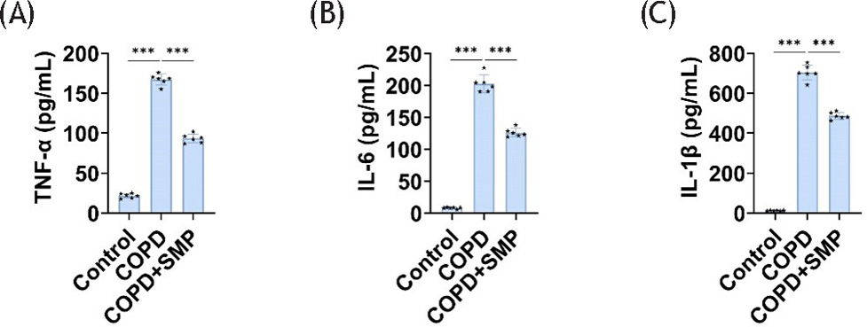 Figure 1 SMP reduces inflammation in COPD mice. ELISA detects TNF-α (A), IL-6 (B), and IL-1β (C) levels in lung tissue. Data are presented as mean ± SD. *** P < 0.001 versus the control group or COPD group. n=6.