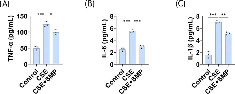 Figure 2 SMP enhances AM’s anti-inflammatory properties. ELISA detects TNF-α (A), IL-6 (B), and IL-1β (C) levels in cells. Data are presented as mean ± SD. *P < 0.05, **P < 0.01, *** P < 0.001 versus the control group or CSE group. n = 3.