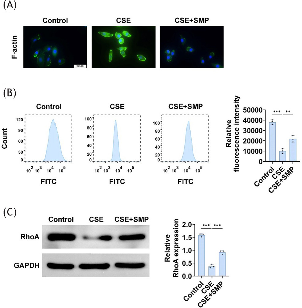 Figure 3 SMP enhances AM’s phagocytosis function. (A) F-actin ring staining image of AM. (B) Flow cytometry measurements of mean fluorescence intensity. (C) Western blotting to detect RhoA expression in cells. Data are presented as mean ± SD. **P<0.01, *** P < 0.001 versus the control group or CSE group. n=3.