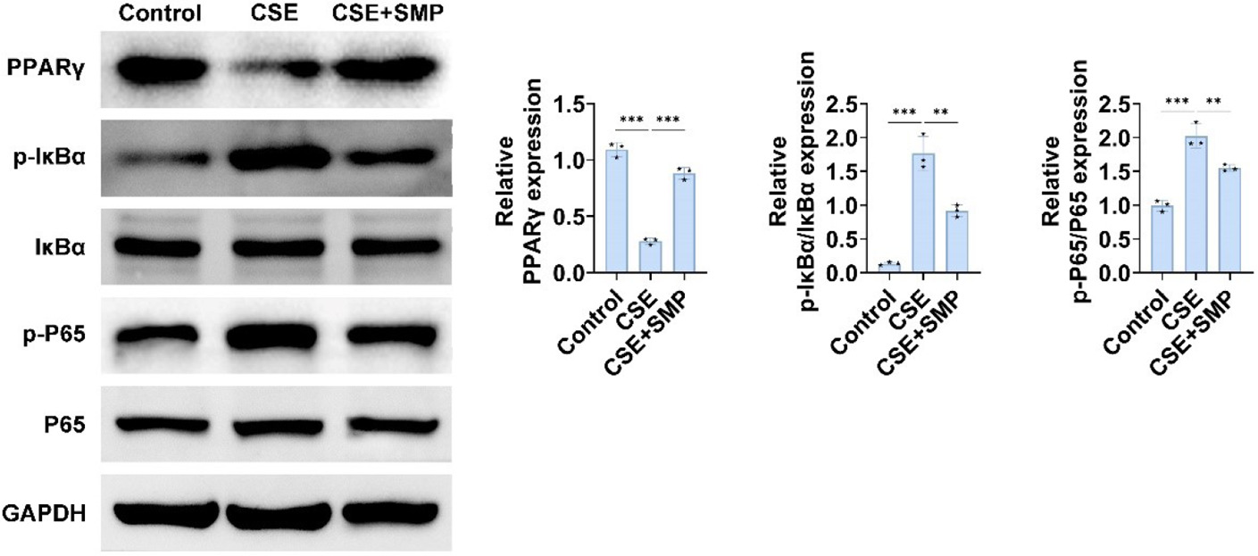 Figure 4 SMP inhibits PPARγ and NF-κB signaling pathway expression. Western blotting to detect PPARγ, IκBα, p-IκBα, p65, p-p65 expression in cells. Data are presented as mean ± SD. ** P < 0.01, *** P < 0.001 versus the control group or CSE group. n=3.
