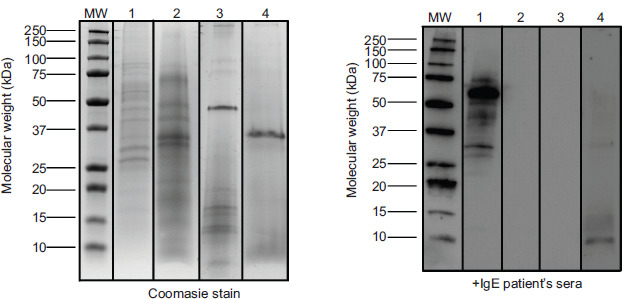 Samples were analyzed by sodium dodecyl sulfate–polyacrylamide gel electrophoresis (SDS-PAGE) to determine protein profile. For western blot analysis, proteins were transferred to a nitrocellulose membrane, incubated overnight with patient serum, and treated with mouse anti-human IgE 1:2000 dilution for 1 h prior to visualization of bands by chemiluminescence.