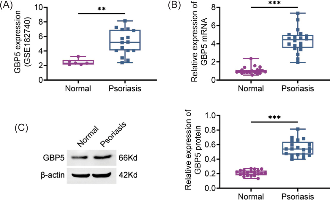 Figure 1 GBP5 is highly expressed in psoriasis skin tissues. (A) GBP5 expression levels in normal and psoriasis skin tissues were analyzed using the GSE182740 dataset. (B) Relative expression of GBP5 mRNA in normal and psoriasis skin tissues measured by qPCR. (C) Relative expression of GBP5 protein in normal and psoriasis skin tissues analyzed by Immunoblot analysis. Data are presented as mean ± SD. **P < 0.01, ***P < 0.001, compared to control.