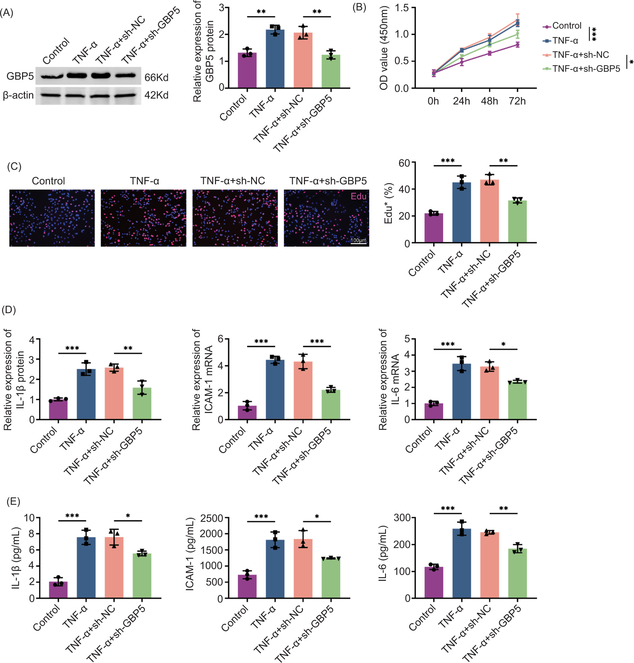 Figure 2 Knockdown of GBP5 reduces TNF-α-induced proliferation and inflammation in HaCaT cells. (A) Immunoblot analysis showing the relative expression of GBP5 protein in HaCaT cells treated with TNF-α with or without sh-GBP5 knockdown. (B) Cell proliferation measured by CCK-8 assay at different time points (0 h, 24 h, 48 h, 72 h) in control, TNF-α, TNF-α+sh-NC, and TNF-α+sh-GBP5 groups. (C) Edu staining showing the percentage of proliferating cells in control, TNF-α, TNF-α+sh-NC, and TNF-α+sh-GBP5 groups. Scale bar: 100 um. (D) Relative expression levels of IL-1β, ICAM-1, and IL-6 mRNA in HaCaT cells measured by qPCR in control, TNF-α, TNF-α+sh-NC, and TNF-α+sh-GBP5 groups. (E) Levels of IL-1β, ICAM-1, and IL-6 in cell culture supernatants measured by ELISA in control, TNF-α, TNF-α+sh-NC, and TNF-α+sh-GBP5 groups. Data are presented as mean±SD. **P < 0.01, ***P < 0.001, compared to control and TNF+sh-NC.