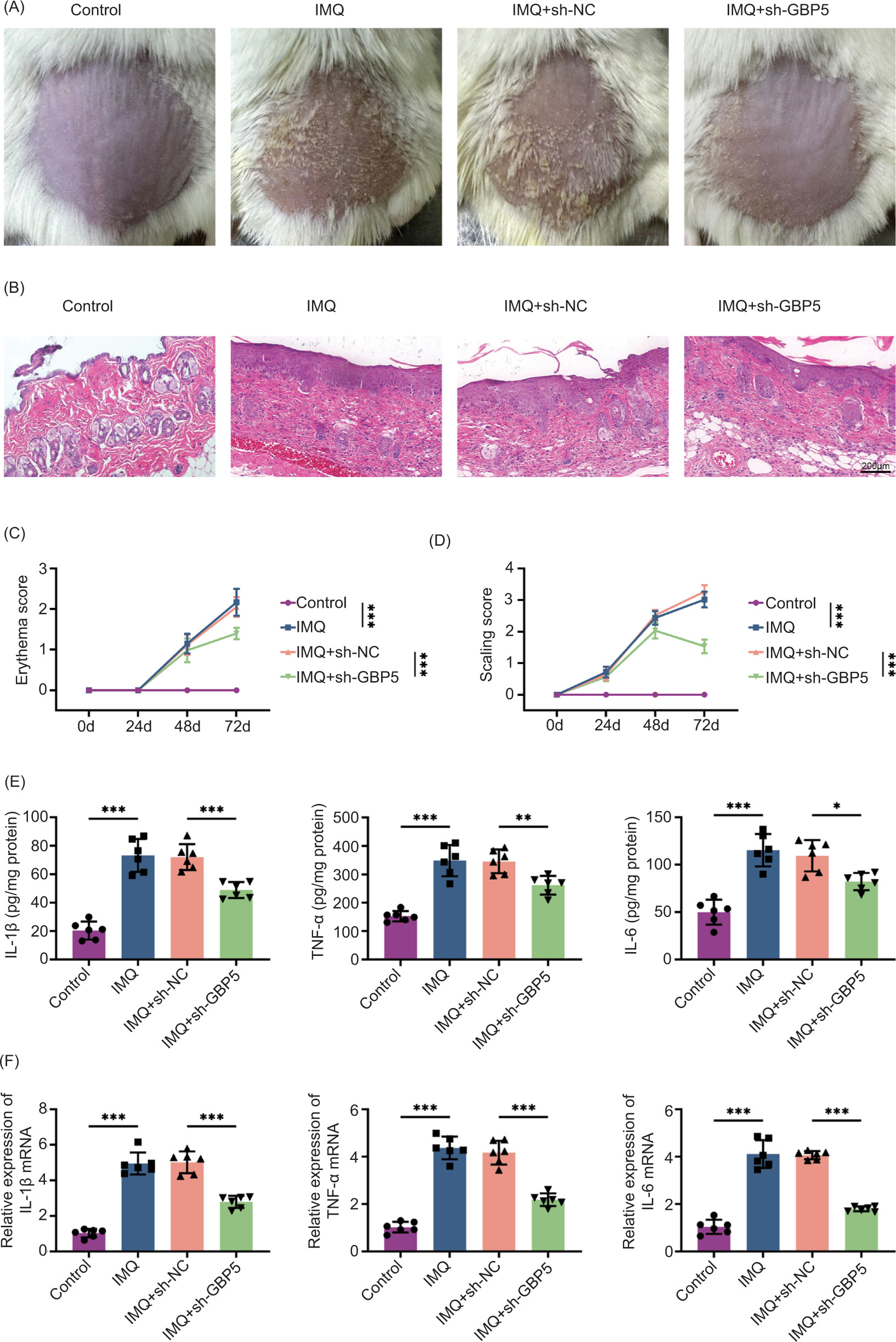 Figure 3 Knockdown of GBP5 alleviates psoriasis symptoms in IMQ-induced mice. (A) Photographs showing the skin condition of IMQ-induced mice treated with sh-GBP5, compared to control, IMQ, and IMQ+sh-NC groups. (B) Histological analysis of skin tissues from different groups stained with H&E. (C) Erythema scores of mice in control, IMQ, IMQ+sh-NC, and IMQ+sh-GBP5 groups over time. (D) Scaling scores of mice in control, IMQ, IMQ+sh-NC, and IMQ+sh-GBP5 groups over time. (E) Levels of IL-1β, TNF-α, and IL-6 in skin tissues measured by ELISA in control, IMQ, IMQ+sh-NC, and IMQ+sh-GBP5 groups. (F) Relative expression levels of IL-1β, TNF-α, and IL-6 mRNA in skin tissues measured by qPCR in control, IMQ, IMQ+sh-NC, and IMQ+sh-GBP5 groups. Data are presented as mean±SD. *P < 0.05, **P< 0.01, ***P< 0.001, compared to control and TNF+sh-NC.