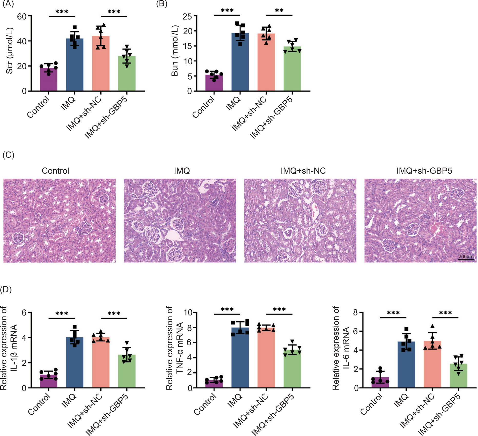 Figure 4 Knockdown of GBP5 reduces renal damage in IMQ-induced mice. (A) Serum creatinine (Scr) levels in control, IMQ, IMQ+sh-NC, and IMQ+sh-GBP5 groups. (B) Blood urea nitrogen (Bun) levels in control, IMQ, IMQ+sh-NC, and IMQ+sh-GBP5 groups. (C) Histological analysis of kidney tissues from different groups stained with H&E. Scale bar: 200 um. (D) Relative expression levels of IL-1β, TNF-α, and IL-6 mRNA in kidney tissues measured by qPCR in control, IMQ, IMQ+sh-NC, and IMQ+sh-GBP5 groups. Data are presented as mean±SD. **P < 0.01, ***P < 0.001, compared to control.