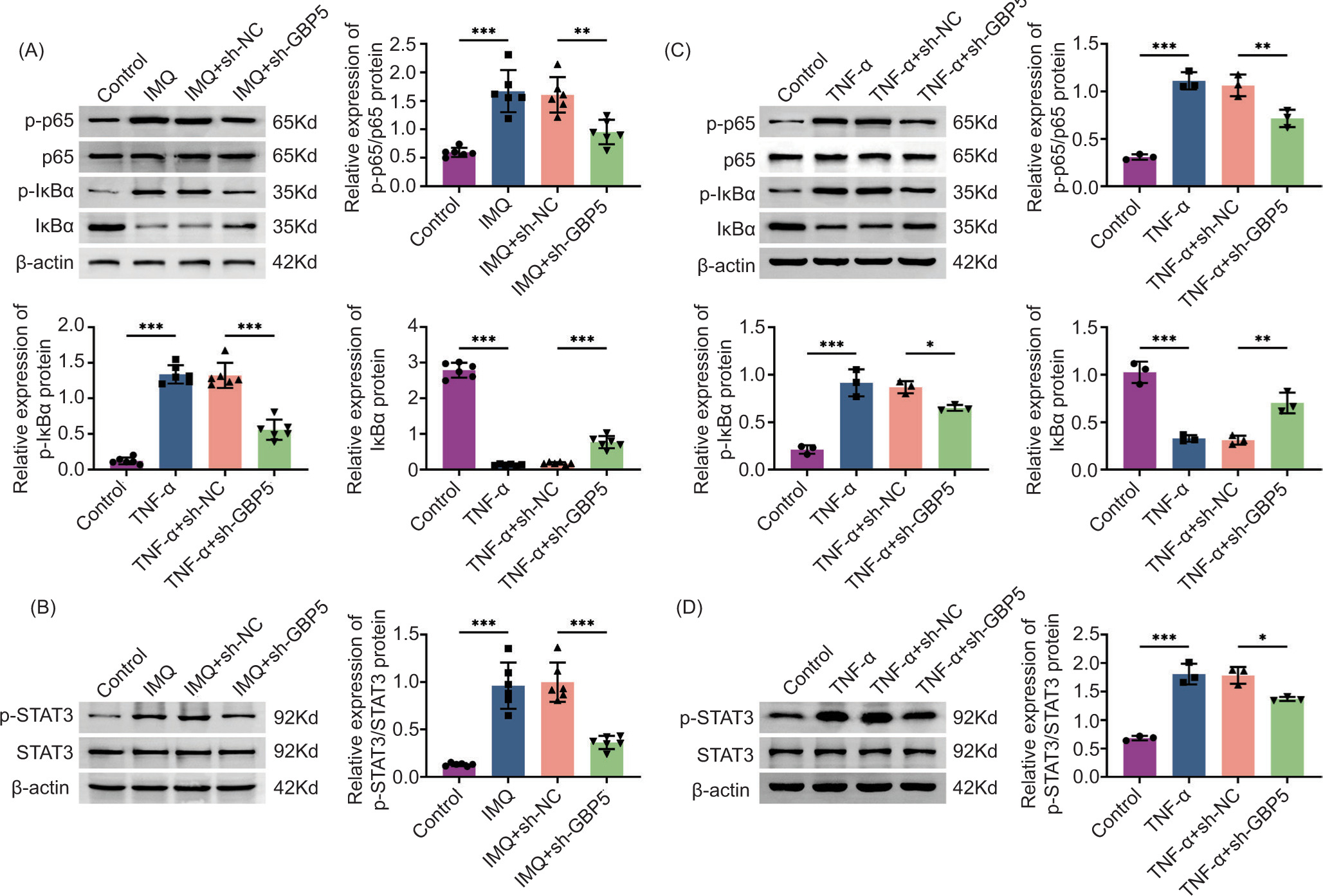 Figure 5 Knockdown of GBP5 regulates the NF-κB/STAT3 pathway in IMQ-induced mice and TNF-α-induced HaCaT cells. (A) Immunoblot analysis showing the relative expression of p-p65/p65 and p-IκBα/IκBα proteins in kidney tissues in control, IMQ, IMQ+sh-NC, and IMQ+sh-GBP5 groups. The expression and phosphorylation levels of the indicated proteins were measured. (B) Immunoblot analysis showing the relative expression of p-STAT3/STAT3 proteins in kidney tissues in control, IMQ, IMQ+sh-NC, and IMQ+sh-GBP5 groups. The expression and phosphorylation levels of the indicated proteins were measured. (C) Immunoblot analysis showing the relative expression of p-p65/p65 and p-IκBα/IκBα proteins in HaCaT cells in control, TNF-α, TNF-α+sh-NC, and TNF-α+sh-GBP5 groups. The expression and phosphorylation levels of the indicated proteins were measured. (D) Immunoblot analysis showing the relative expression of p-STAT3/STAT3 proteins in HaCaT cells in control, TNF-α, TNF-α+sh-NC, and TNF-α+sh-GBP5 groups. The expression and phosphorylation levels of the indicated proteins were measured. Data are presented as mean±SD. **P < 0.01, ***P < 0.001, compared to control.