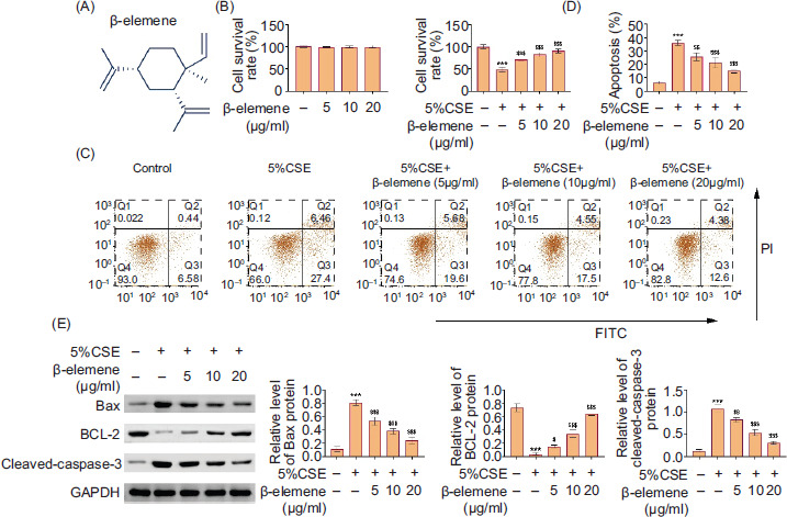 Figure 1 β-elemene aggrandized cell viability and reduced cell apoptosis in BEAS-2B cells stimulated by cigarette smoke. (A) The chemical formula of β-elemene was displayed, and the cytotoxicity of β-elemene (5, 10, and 20 μg/mL) was proved through CCK-8 assay. (B) The cell survival rate was confirmed through CCK-8 assay in control, 5% CSE, 5% CSE+β-elemene (5 μg/mL), 5% CSE+β-elemene (10 μg/mL), and 5% CSE+β-elemene (20 μg/mL) groups. (C–D) The cell apoptosis was evaluated through flow cytometry in control, 5% CSE, 5% CSE+β-elemene (5 μg/mL), 5% CSE+β-elemene (10 μg/mL), and 5% CSE+β-elemene (20 μg/mL) groups. (E) The protein expressions of Bax, BCL-2, and cleaved caspase 3 were measured through Western blot analysis in control, 5% CSE, 5% CSE+β-elemene (5 μg/mL), 5% CSE+β-elemene (10 μg/mL), and 5% CSE+β-elemene (20 μg/mL) groups. ***P < 0.001 versus the control group; $P < 0.05, $$P < 0.01, $$$P < 0.001 versus the 5% CSE group.