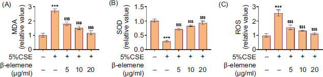 Figure 2 β-elemene can alleviate cigarette smoke-evoked oxidative stress. Groups were separated as follows: control, 5% CSE, 5% CSE+β-elemene (5 μg/mL), 5% CSE+β-elemene (10 μg/mL), and 5% CSE+β-elemene (20 μg/mL) groups. (A) The MDA level was assessed through MDA kit. (B) The SOD level was tested through SOD kit. (C) The ROS level was examined through ROS kit. ***P < 0.001 versus the control group; $$$P < 0.001 versus the 5% CSE group.