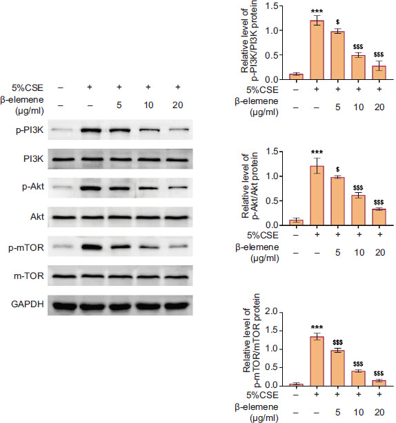 Figure 4 β-elemene refrained the PI3K/AKT/mTOR pathway. Groups were separated as follows: control, 5% CSE, 5% CSE+β-elemene (5 μg/mL), 5% CSE+β-elemene (10 μg/mL), and 5% CSE+β-elemene (20 μg/mL) groups. The protein expressions of p-PI3K, PI3K, p-AKT, AKT, m-TOR, and p-mTOR were determined through Western blot analysis. ***P < 0.001 versus the control group; $P < 0.05, $$$P < 0.001 versus the 5% CSE group.