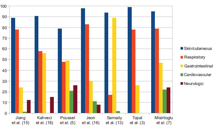 Figure 1 Comparison of manifestations of infant anaphylaxis by organ systems in reported studies.3,13,5,7,15,16,18
