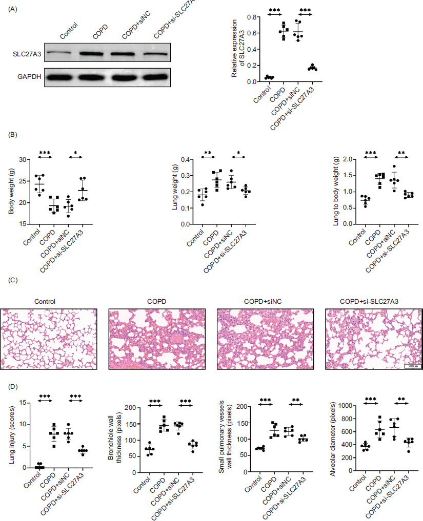 Figure 2 Knockdown of SLC27A3 improves lung injury in COPD mice. (A) Protein expression of SLC27A3 in lung tissue. (B) Mouse weight, lung weight, and lung index. (C) H&E staining to detect pathological changes of lung tissue in each group. (D) Statistics of lung injury scores, bronchial wall thickness, small pulmonary vessels wall thickness, and alveolar diameter. Values are presented as mean ± SD. *p < 0.01, **p < 0.01, ***p < 0.001. n=6.