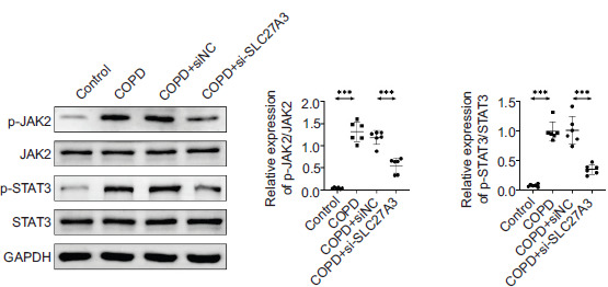 Western blotting was utilized to analyze the protein expression levels of JAK2, p-JAK2, STAT3, and p-STAT3 in the lung tissue. Research findings suggest that the phosphorylation levels of JAK2 and STAT3 are suppressed in the context of COPD when SLC27A3 is knocked down (Figure 5). SLC27A3 is thought to stimulate the JAK2/STAT3 pathway in COPD.