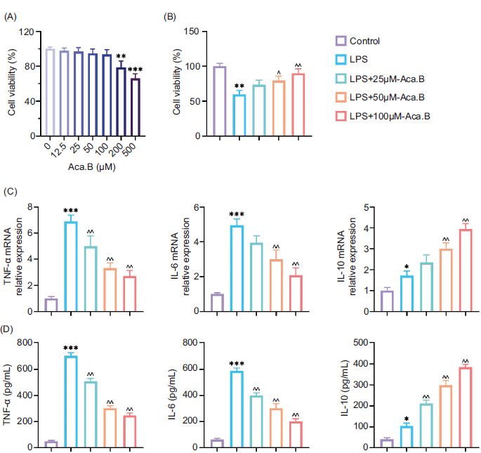 Figure 1 Aca.B ameliorates LPS-induced MODE-K cell injury and inflammatory factor secretion. (A) Effect of Aca.B at various concentrations on MODE-K cell viability. (B) Aca.B at various concentrations promoted MODE-K cell survival under LPS treatment. (C) Aca.B at various concentrations affected inflammatory factor (TNF-α, IL-6 and IL-10) expression at the mRNA level, as detected by RT-PCR. (D) Aca.B at various concentrations affected.