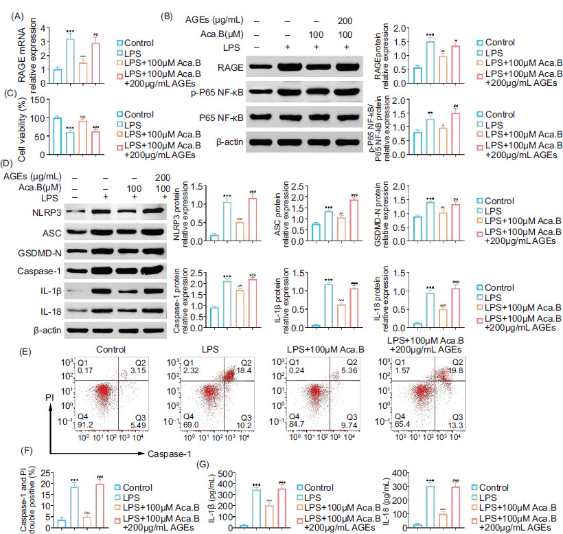In order to verify whether the downregulation of AGE was essential for the therapeutic effect of Aca.B on inflammatory injury of epithelial cells, we added exogenous AGE (200 μg/mL) to MODE-K cells treated with LPS and Aca.B. Notably, exogenous AGE counteracted the protective effects of Aca.B on LPS-induced cell injury, evidenced by a decrease in cell viability (Figure 6B). Moreover, cells treated with both Aca.B and AGE showed higher RAGE and p-P65 NF-κB expression than those treated with Aca.B alone, indicating that AGE decreaseds inflammatory response (Figures 6A and 6C). Considering the pyroptosis pathway, AGE increased the expression of pyroptosis-specific biomarkers (NLRP3, ASC, GSDMD-N, Caspase-1, IL-1β, and IL-18) in MODE-K cells treated with Aca.B (Figure 6D). AGE further reactivated caspase-1, which was inhibited by Aca.B, increasing the caspase-1+–PI+ cell ratio from about 5% in LPS+100-μM Aca.B group to 20% in LPS+100 μM Aca.B+200 μg/mL AGE group (Figures 6E and 6F). The inhibition of IL-1β and IL-18 secretion by Aca.B was also counteracted by exogenous AGE (Figure 6G). In summary, these findings indicated that Aca.B ameliorated NLRP3-mediated proptosis in MODE-K cells by inhibiting the AGE/RAGE pathway.
