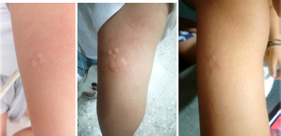 An oral provocation test (OPT) was performed with ibuprofen (1/10, 1/4, and 1/1 of the therapeutic dose in intervals of 1 hour; total cumulative dose 540 mg), which gave a positive result with the immediate appearance of a wheal on the left eyelid which disappeared and, 2 hours after administration, the appearance of itchy erythematous wheals on the dorsal surface of both upper arms that resolved spontaneously without treatment. Subsequently, OPT was conducted with acetylsalicylic acid (total cumulative dose 785 mg) and with metamizole (total cumulative dose 810 mg), which caused the appearance of the same wheals on the dorsal surface of her arms between 1 and 3 hours after administration, which resolved spontaneously. The wheals were completely similar to those occurring in previous episodes (Figure 1). No other skin manifestations or systemic symptoms were noted. The girl continues tolerating paracetamol, and also tolerated an OPT with meloxicam. Other laboratory tests or the performance of a biopsy were not considered useful nor convenient for this patient.