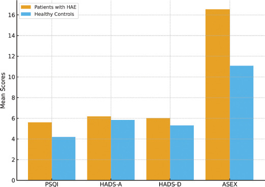 Material and Methods: In all, 40 patients diagnosed with type 1 and type 2 HAE were followed up in the Immunology and Allergy Clinic, and 40 healthy controls were included in the study. Participants completed the Arizona Sexual Experience Scale (ASEX), Pittsburgh Sleep Quality Index (PSQI), and Hospital Anxiety and Depression Scale (HADS).