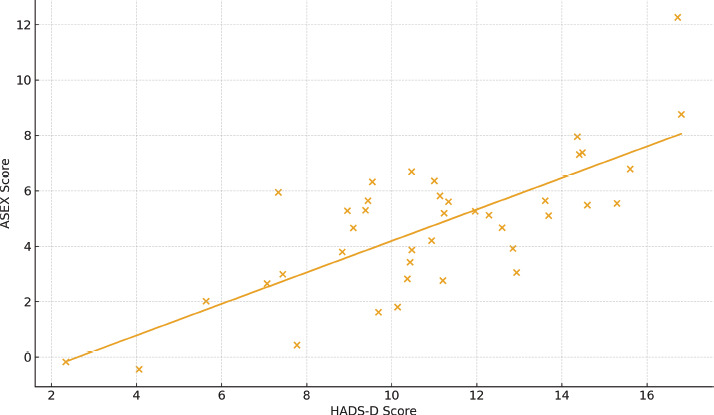 Figure 4 ASEX versus HADS-D. Notes. Scatter plot demonstrates the relationship between ASEX and HADS-D scores. A moderate positive association is visible, with higher depressive symptoms tending to coincide with greater sexual dysfunction. The regression line reflects the direction of association; however, the plot does not imply causality. ASEX: Arizona Sexual Experiences Scale; HADS-D: Hospital Anxiety Depression Scale – Depression.