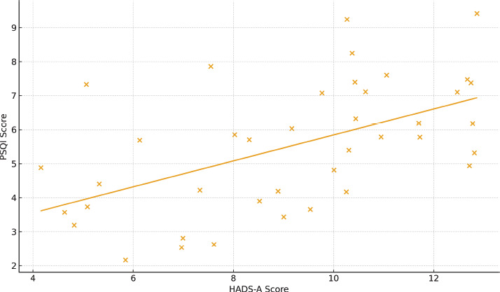 Figure 5 PSQI versus HADS-A. Notes. Scatter plot visualizing the association between PSQI and HADS-A scores. Anxiety symptoms show a moderate-to-strong positive relationship with poorer sleep quality. The regression line illustrates the upward trend in this association, without implying a causal effect. PSQI: Pittsburgh Sleep Quality Index; HADS-A: Hospital Anxiety Depression Scale – Anxiety.