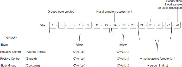 The Sham group received no intervention. The Negative Control (allergic rhinitis) group was designed as an AR model and received no treatment. The Positive Control (steroid) and Study (curcumin) groups, also designed as AR models, received intranasal steroid and intranasal curcumin, respectively (Figure 1).