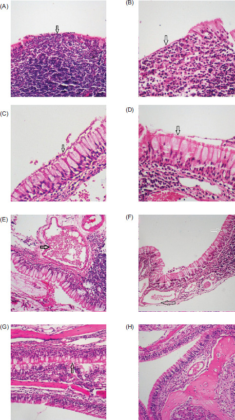 Figure 2 Histopathological examination. (A) Inflammatory cells infiltrating epithelium in the Negative Control group (HEx100). (B) Inflammation and small number of eosinophils are observed in the Study group (HEx200). (C) Increased goblet cells and cilia loss in the Negative Control group (HEx400). (D) Significantly decreased cilia loss in the Study group (HEx400). (E) Increased vascular congestion in the Negative Control group (HEx200). (F) Significantly reduced congestion (black arrow) and mildly increased goblet cells (white arrow) in the Study group (HEx100). (G) Little increase in goblet cells and no inflammation observed in the Positive Control group (HEx200). (H) Normal mucosa in the Sham group (HEx100).