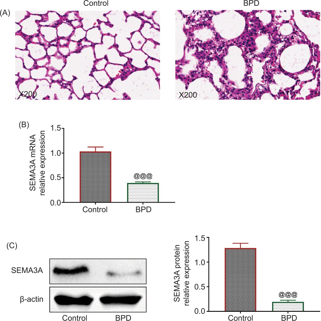 Figure 1 SEMA3A was downregulated in hyperoxia-induced BPD rats. (A) Hematoxylin-eosin staining established that hyperoxia induced severe lung injuries, including inflammatory cell infiltration, reduced alveolar number, and enhanced alveolar interval and alveolar volume in BPD rats. (B) The mRNA expression of SEMA3A was reduced in lung tissue isolated from hyperoxia-induced rats compared to the control group. (C) The protein expression of SEMA3A was reduced in lung tissue isolated from hyperoxia-induced rats compared to the control group. @@@ vs. control, P < 0.001. BPD: bronchopulmonary dysplasia; SEMA3A: semaphorin 3A.