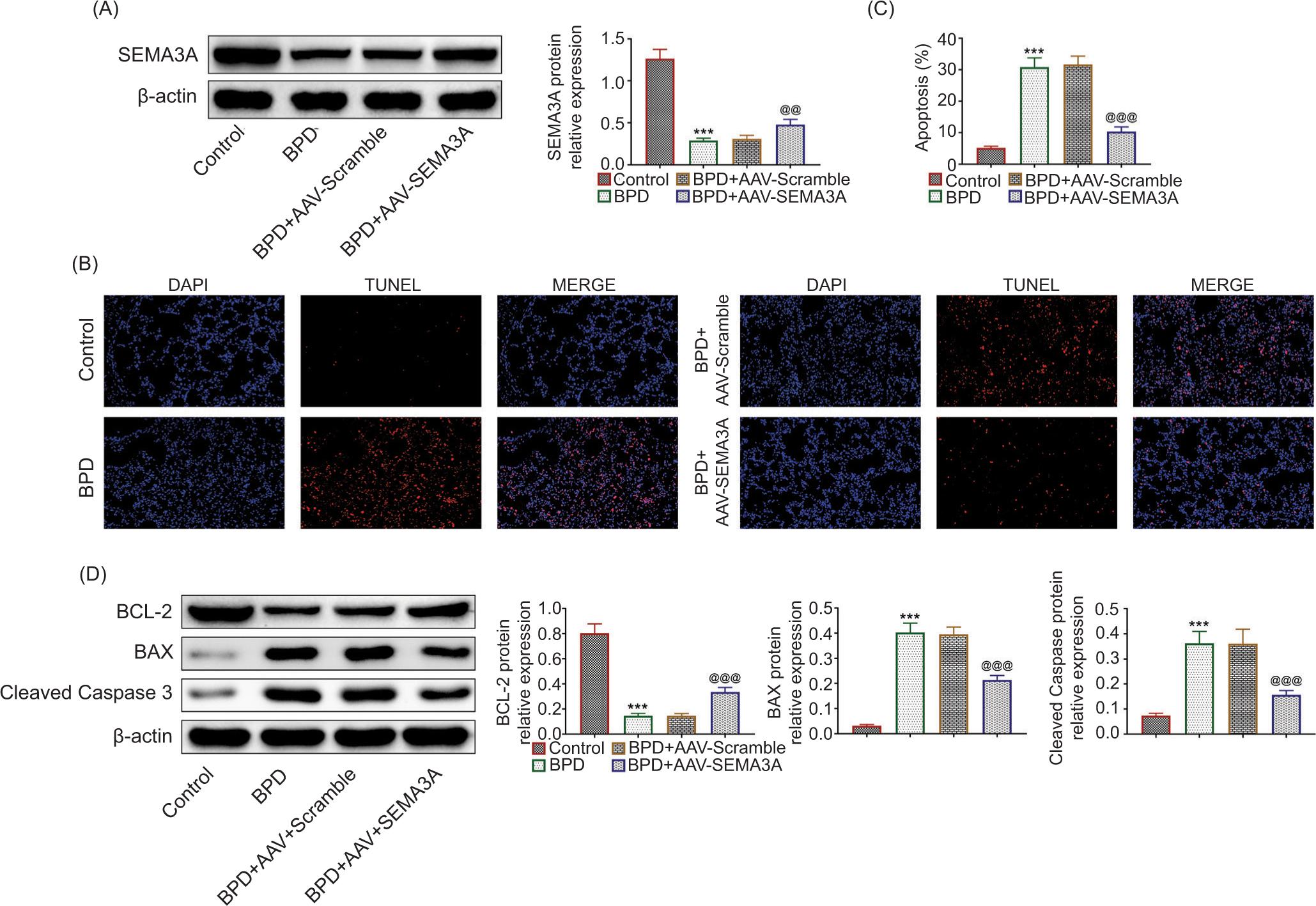 Figure 2 SEMA3A suppressed hyperoxia-induced cell apoptosis in BPD rats. (A) AAV-SEMA3A injection promoted the protein expression of SEMA3A. (B) AAV-SEMA3A injection attenuated hyperoxia-induced cell apoptosis in BPD rats. (C) AAV-SEMA3A injection attenuated hyperoxia-induced increased number of TUNEL-positive cells in BPD rats. (D) AAV-SEMA3A injection attenuated hyperoxia-induced reduced expression of Bcl-2, and enhanced expression levels of Bax and cleaved caspase-3 in BPD rats. *** vs. control, P < 0.001. @@, @@@ vs. BPD+AAV-Scramble, P < 0.01, P < 0.001. BPD: bronchopulmonary dysplasia; SEMA3A: semaphorin 3A.