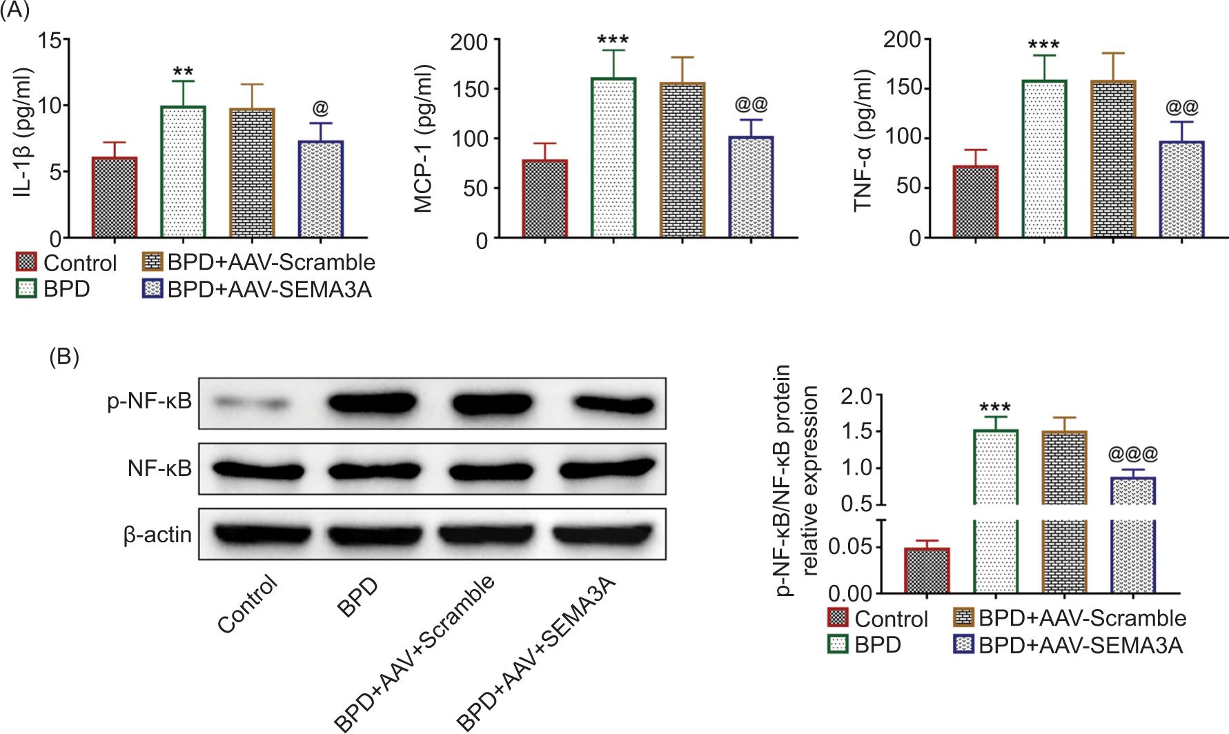 Figure 3 SEMA3A suppressed hyperoxia-induced inflammation in BPD rats. (A) AAV-SEMA3A injection attenuated hyperoxia-induced increased levels of IL-1β, MCP-1, and TNF-α. (B) AAV-SEMA3A injection attenuated hyperoxia-induced increased expression of NF-κB phosphorylation. *** vs. control, P < 0.001. @, @@, @@@ vs. BPD+AAV-Scramble, P < 0.05, P < 0.01, P < 0.001. IL-1β: interleukin-1β; MCP-1: monocyte chemoattractant protein-1; TNF-α: tumor necrosis factor alpha; SEMA3A: semaphorin 3A.