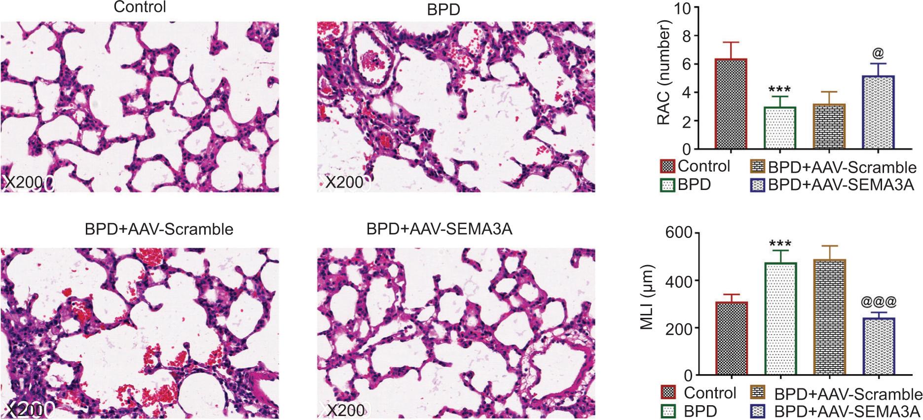 Figure 4 SEMA3A ameliorated hyperoxia-induced histopathological changes in BPD rats. AAV-SEMA3A injection ameliorated hyperoxia-induced alveolar injury, simplification, and inflammation, and attenuated hyperoxia-induced decreased number of RAC and increased volume of MLI. **, *** vs. control, P < 0.01, P < 0.001. @, @@@ vs. BPD+AAV-Scramble, P < 0.05, P < 0.001. RAC: radial alveolar count; MLI: mean linear intercept; SEMA3A: semaphorin 3A.