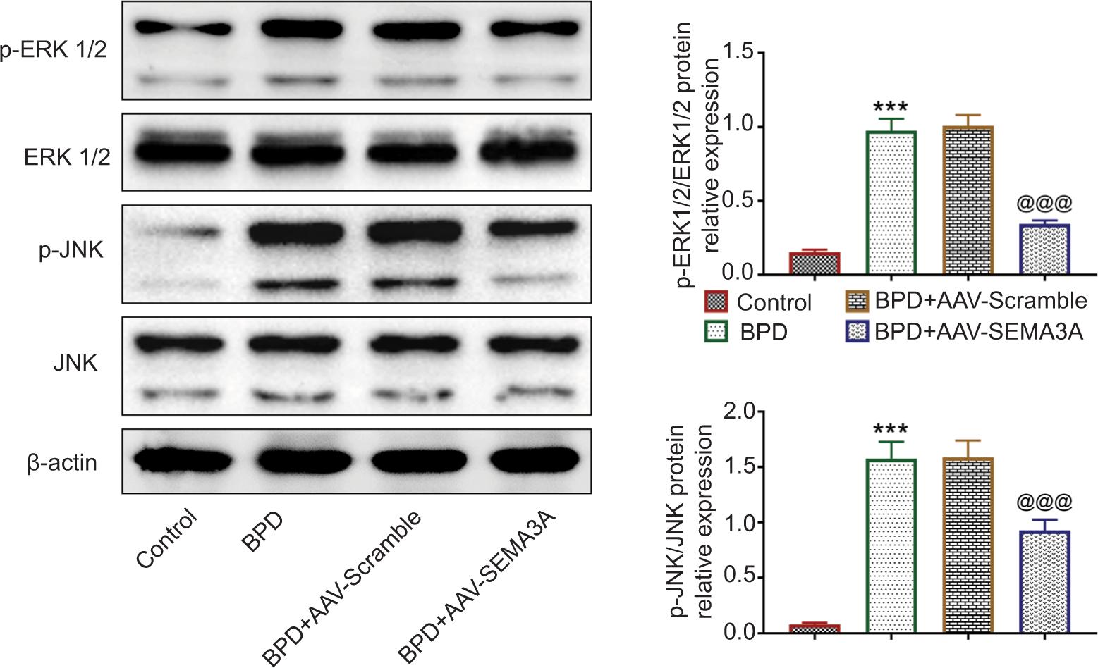 Figure 5 SEMA3A suppressed the activation of ERK/JNK pathway in BPD rats. AAV-SEMA3A injection attenuated hyperoxia-induced increased expression levels of ERK and JNK phosphorylation. *** vs. control, P < 0.001. @@@ vs. BPD+AAV-Scramble, P < 0.001. SEMA3A: semaphorin 3A.