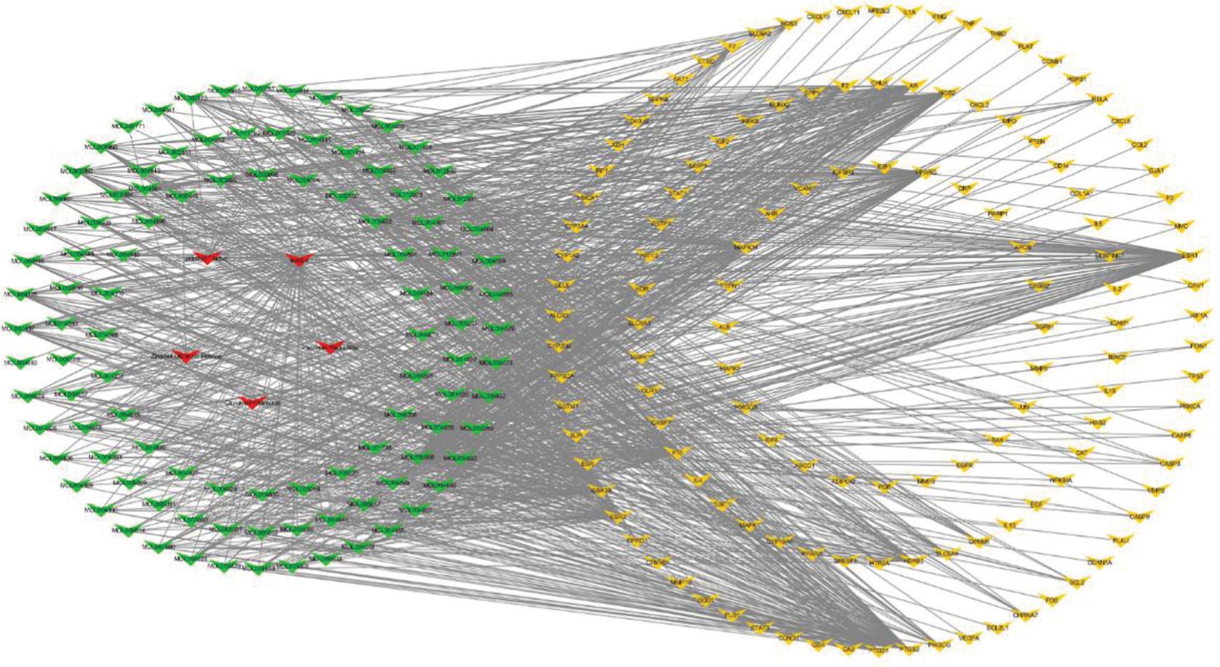 Figure 3 Drugs–active components–targets network. Note. Red nodes represent drugs, green nodes represent active components, and yellow nodes represent targets.