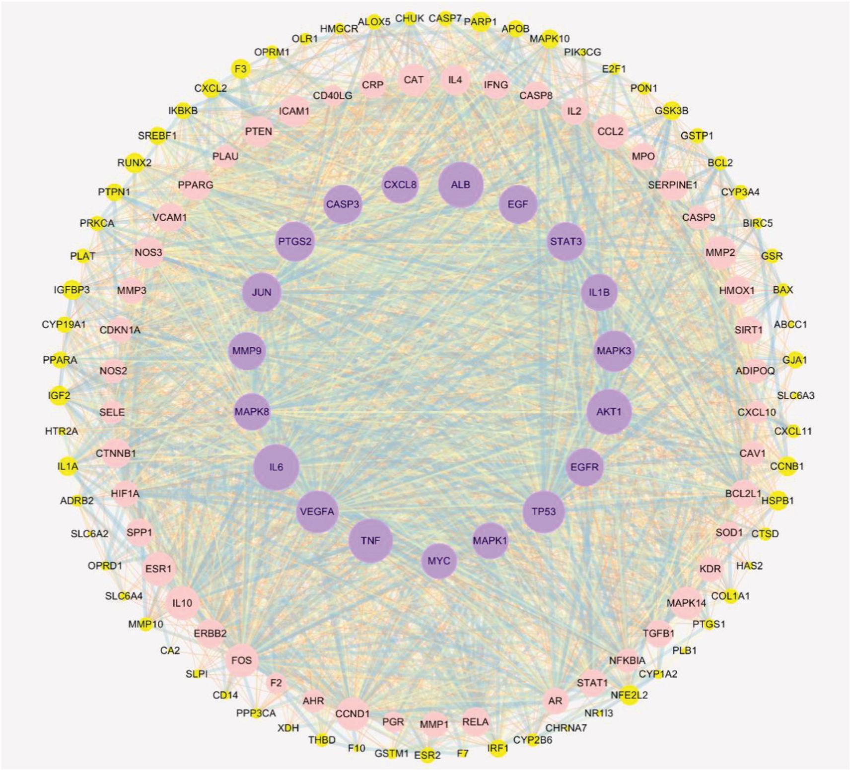 1 | 48.9 | 59 | 1419 | PLAU, PPARG, MYC, PTEN. RELA, EGF, ICAM1,STAT3, CD40LG, IL1B, MAPK3, CRP, MMP1, CAT, IL4, IFNG, CASP8, IL2, CCL2, MPO, SERPINE1, CASP9, CCND1, MMP2, HMOX1, SIRT1, ADIPOQ, FOS, AKT1, BCL2L1, EGFR, TP53, ERBB2, TNF, IL10, KDR, VEGFA, CCNB1, ESR1, IL-6, MAPK14, MAPK8, SPP1, MMP9, TGFB1, JUN, HIF1A, PTGS2,MAPK1,CTNNB1, SELE, STAT1, CASP3, CXCL8, MMP3, AR, NOS3, ALB, VCAM1 |