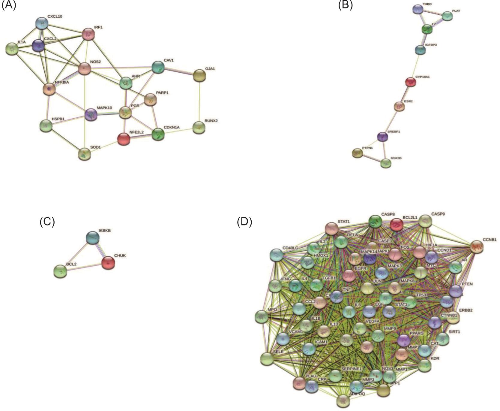 The MCODE network analysis revealed four clusters. The scores were 48.9, 4.6, 3.0, and 2.5 respectively. The highest scoring cluster, cluster 1, contained 59 nodes (PLAU, PPARG, MYC, PTEN. RELA, EGF, ICAM1, STAT3, CD40LG, IL1B, MAPK3, CRP, MMP1, CAT, IL4, IFNG, CASP8, IL2, CCL2, MPO, SERPINE1, CASP9, CCND1, MMP2, HMOX1, SIRT1, ADIPOQ, FOS, AKT1, BCL2L1, EGFR, TP53, ERBB2, TNF, IL10-KDR, VEGFA, CCNB1, ESR1, IL-6, MAPK14, MAPK8, SPP1, MMP9, TGFB1, JUN, HIF1A, PTGS2, MAPK1, CTNNB1, SELE, STAT1, CASP3, CXCL8, MMP3, AR, NOS3, ALB, and VCAM1) and 1419 edges. Cluster 2 contained 17 nodes (RUNX2, NFKBIA, AHR, IL1A, IRF1, CXCL2, NFE2L2, CXCL10, HSPB1, NOS2, CAV1, PARP1, CDKN1A, MAPK10, PGR, GJA1, and SOD1) and 37 edges. Cluster 3 contained three nodes (BCL2, IKBKB, and CHUK) and three edges. The details of other clusters are provided in Figure 5 and Table 3.