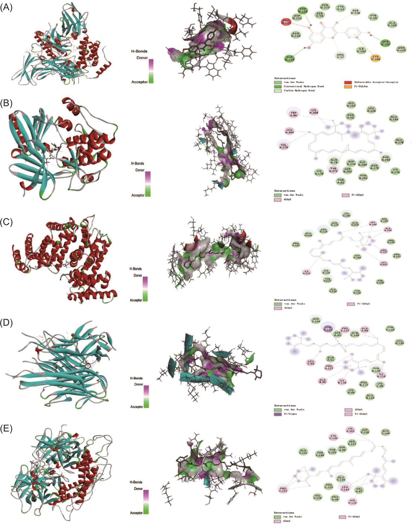Figure 7 Molecular docking. Binding mode of (A) IL-6 with kaempferol; (B) AKT1 with β-carotene; (C) ALB with β-carotene; (D) TNF with β-carotene; and (E) TP53 with β-carotene.