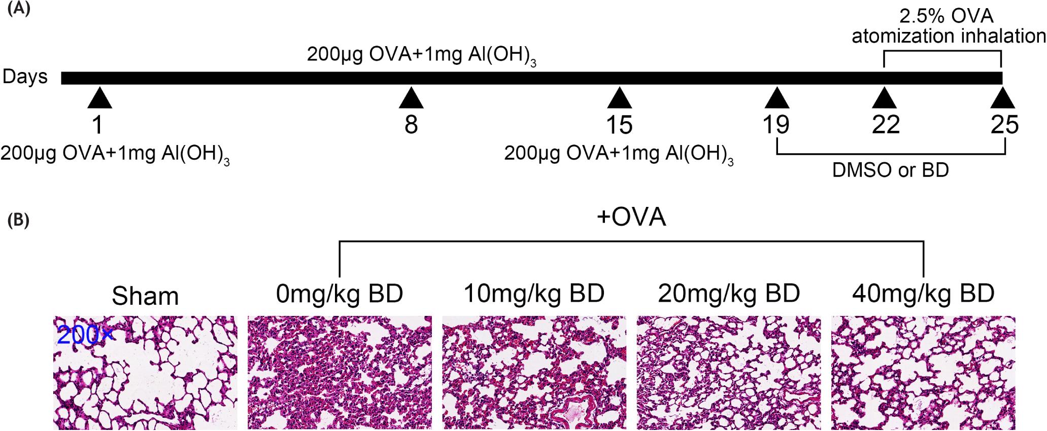 Figure 1 Pulmonary morphological changes in OVA-challenged mice treated with or without BD. (A) Schematic diagram of the experimental procedure. (B) An animal model of OVA-induced allergic asthma was established in BALB/c mice. The OVA, OVA + 10 mg/kg BD, OVA + 20 mg/kg BD, and OVA + 40 mg/kg BD groups (n = 5 per group) were treated with BD at various doses or DMSO from Day 19 to Day 25 of OVA stimulation. The Sham group (n = 5) received no OVA exposure. The lung tissues were harvested at 24 h after the last OVA inhalation, sectioned, and stained with H&E. The images were observed at ×200 magnification.