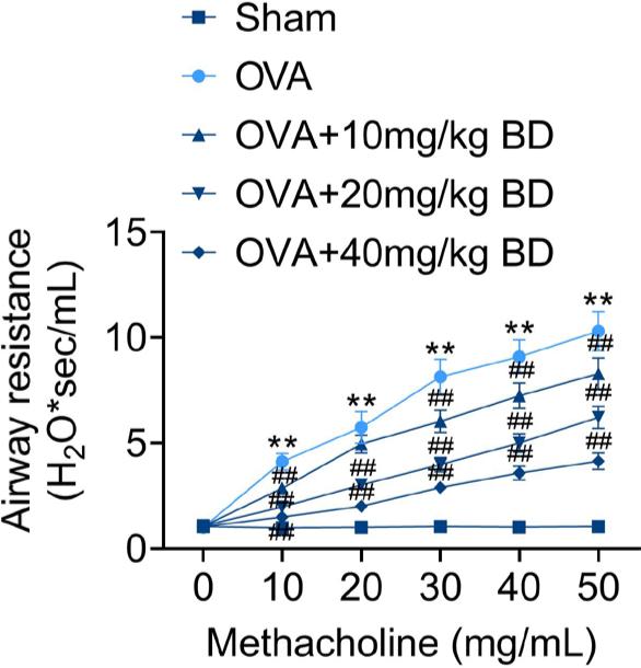 Figure 2 Effect of BD on AHR in mice with OVA-induced allergic asthma. The AHR assessment was performed 24 h after the final OVA challenge. Mice were administered with increasing concentrations of methacholine (0–50 mg/mL) under anesthesia. The airway resistance of each mouse was assessed. **p < 0.01 compared with the Sham group; ##p < 0.01 compared with the OVA group.